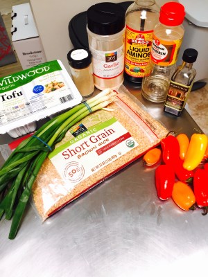 - Mix together seasonings, olive oil, vinegar, soy sauce, and mirin in a large cooking skillet and then add tofu and peppers, cooking over medium heat for ten minutes
