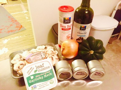 - Dice onion and mushrooms and place in a medium skillet with other half of olive oil, salt, and pepper, cooking until tender