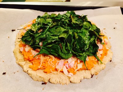 - Spread sweet potato over crust, topping with parmesan, diced onion, and spinach