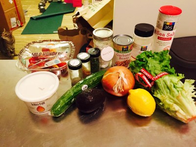 - Build your bowl, starting with lettuce, then falafel, then veggies, and top with tzatziki