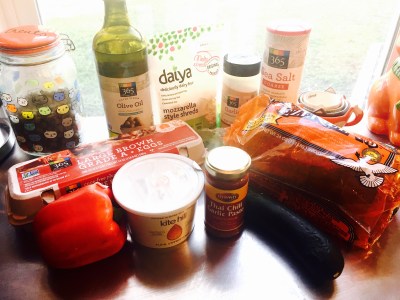 - Assemble sandwich, starting with yogurt sauce, then zucchini, then red pepper, then egg, and top with mozzarella