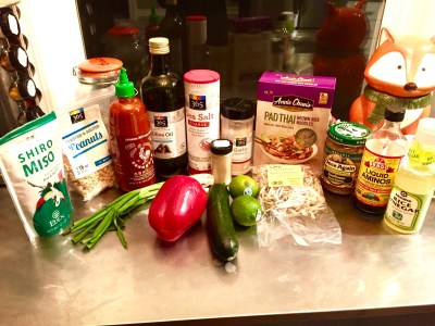 - Add in sunflower butter, liquid aminos, vinegar, sriracha, miso, water, and one lime to veggies, and stir until thickened