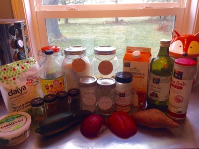 - Dice sweet potato, zucchini, pepper, and onion and place in a large skillet with 1/2 tablespoon of olive oil and salt, cooking until tender
