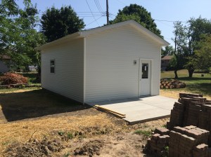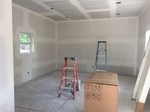 Dry wall is up; we are just waiting for it to dry before painting. Then it will be floor installation, AC/Heat installation, and toilet and vanity installation. Then it will be up to us to move all the equipment in that has been sitting in our garage for the last two weeks!
