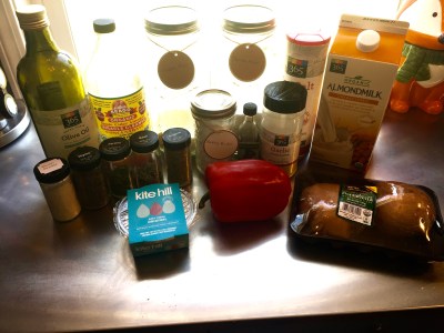 - Slice red pepper and portobellos and place in a large skillet with olive oil, half of balsamic, salt, and onion powder, cooking until tender
