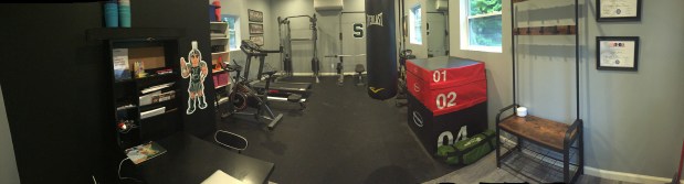 It’s got everything you need for a good workout: bench and squat rack, cable machine, treadmill, bike, rowing machine, free weights, TRX, heavy bag, and lots more! It’s spacious too; the pictures don’t do it justice.