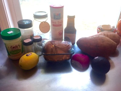 - Cut sweet potatoes in half and top with other half of seasonings, quinoa mixture, mashed avocado, and tahini sauce