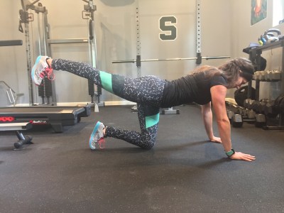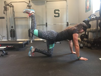 Next, keeping that same knee bent, take your leg up behind you, pushing your heel towards the ceiling so your foot stays flexed. Squeeze through the glute while keeping the core tight. Return the knee back to the ground.