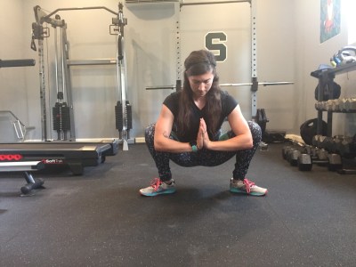 Come into a low squat, feet wider than the hips, toes turned outwards. Trying to reach your glutes down to the ground, keep your chest high. Bring your elbows to the inside of your knees to help push them apart, opening up your inner thighs. Hold.