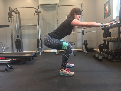 Start in a standing position, feet wider than hip distance apart, feet slightly turned outward. Begin to lower your hips, pushing your butt back behind you, as if you were sitting in a chair. Keep your knees behind your toes. The weight stays in your heels, chest is high, back is straight. Hands come out in front for a counter balance. Push through the heels and hips to return to standing.