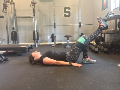 Start by laying on the floor, pressing your lower back down. One foot is planted and knee bent, the other extends out at a 45 degree angle, foot flexed.