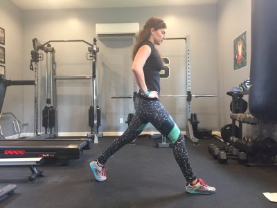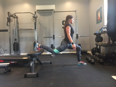 Make sure your torso is straight up and down, not leaning forward, and then begin to bend into the front knee until you come down to a ninety degree angle. You should feel work in the front quad and a stretch in the back hip flexor. Press through the front leg to reverse the movement.