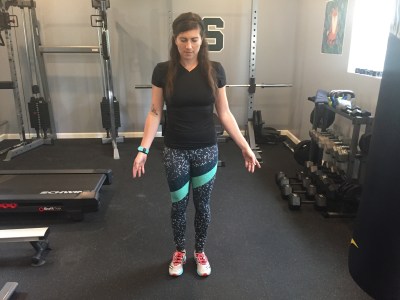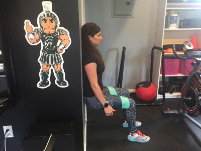 Find a wall that you can lean against. Place your back flat on the wall, core tight, quads squeezing, and lower yourself into a floating chair position, ninety degree angle of the knees. Hold.