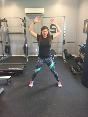 As you jump out with your feet, begin to raise the arms overhead in an arc, squeezing through the shoulders. Knees should still be slightly bent as you land to absorb the shock. To return to standing, jump the feet back in and lower the arms in one movement.
