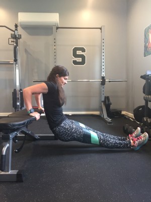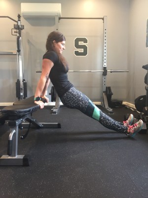 Start with your palms on the bench, fingers facing forward. Extend your legs out, squeezing through the quads and place the weight on your heels (an easier version is to place your feet flat on the ground and bend through the knees).