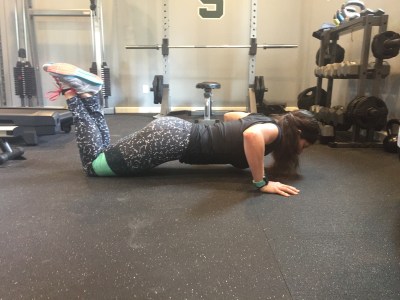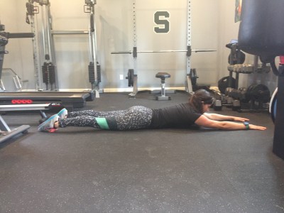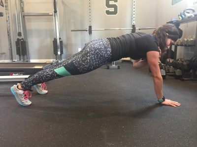 Start in a high plank position, tucking the tail bone under and pushing up through the shoulder blades while tightening your core.