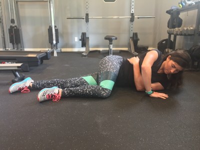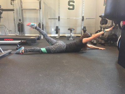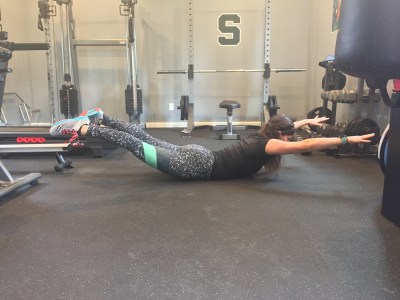 Begin by laying on your stomach, arms and legs stretched out in opposite directions. Tighten your core by sucking your belly button in.