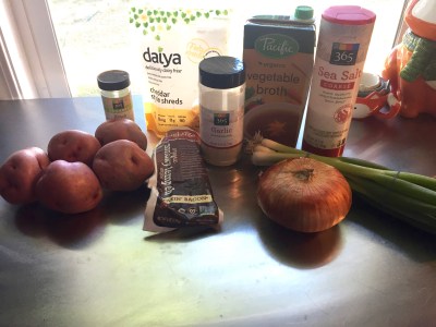 - Dice potatoes and onion and place in a large soup pot with olive oil over medium heat, cooking until tender