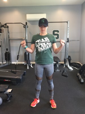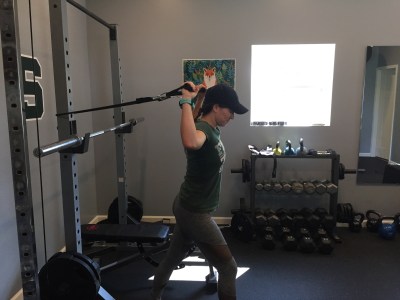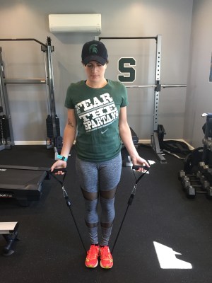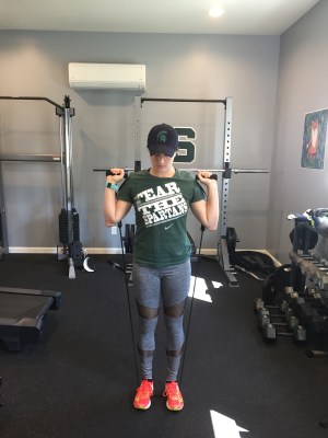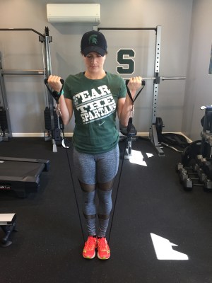 Find something solid to loop your resistance band around. Step out with a staggered stance for balance. Elbows are pointing forward, biceps tight around your ears, palms are facing upward.