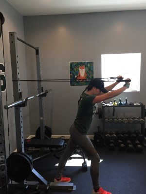 Find something solid to loop your resistance band around. Step out with a staggered stance for balance. Elbows are pointed straight back, forearms parallel to the ground and tight to the body.