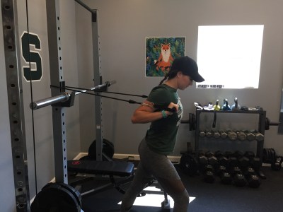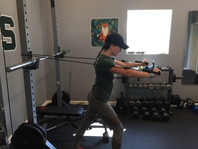 Find something solid to loop your resistance band around. Step out with a staggered stance for balance. Elbows are pointed out to the side, bent at a 90 degree ankle with tension on the resistance band.