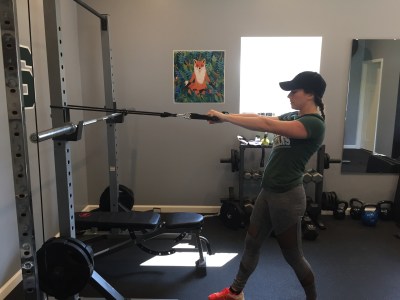 Find something solid to loop your resistance band around. Step backward with a staggered stance for balance, leaning back to create a slightly angle with the body. Arms are held straight out in front to start.