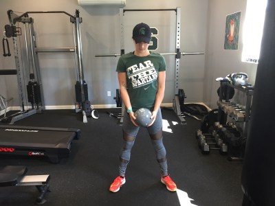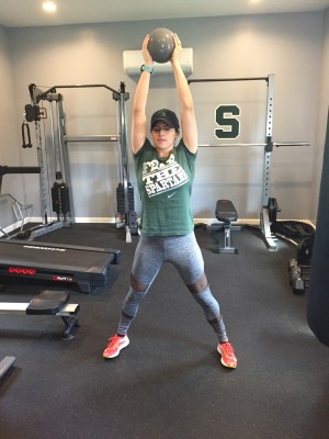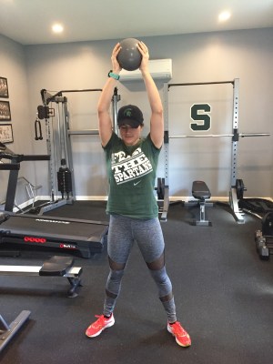 Make a big circle with the medicine ball, working on range of motion in the shoulders. Make sure to go both clockwise and counter clockwise.