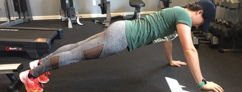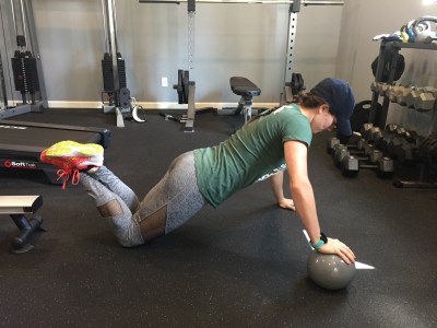Start in either push up position or modified push up position, with one hand on top of the medicine ball. Keep your back straight, core engaged, tailbone tucked under.