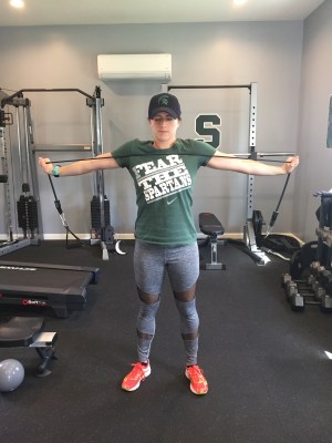 Pull your arms back, bringing elbows wide out to the side, pinching through the shoulder blades as you pull the resistance band back. Reverse the movement to complete one rep.