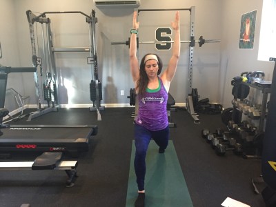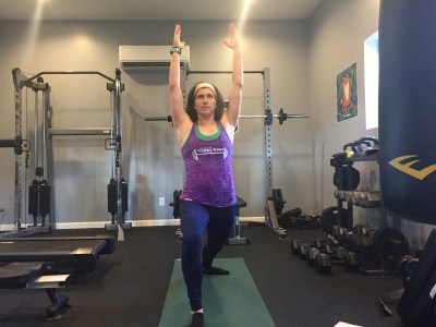 Start by standing at the top of your mat. Take a large step back with one leg and turn the back foot to a 45 degree angle. Bend into the front knee, keeping it pointed straight ahead, and make sure the hips stay even and pointed forward. Drop your shoulders down the back and reach your hands up to the ceiling.