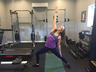 Start in warrior II, and then drop the back arm down to rest at the back of the knee. The front arm raises up toward the ceiling, opening the side of the body while still bending into the front knee.