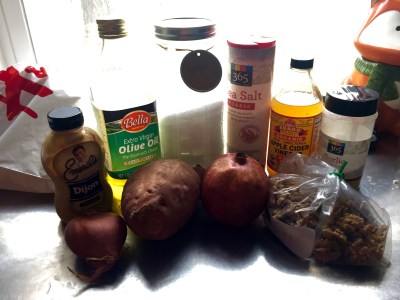 - Assemble salad, starting with spinach, then pomegranate, walnuts, sweet potatoes and shallot, and top with dressing