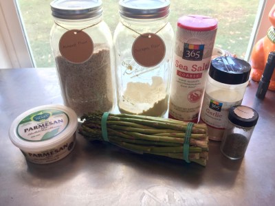 - Place asparagus in chickpea flour, then in the egg, and then in the almond flour mixture and place on baking sheet