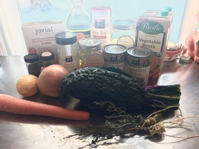 - Add the rest of the broth, almond milk, chopped kale, and pasta and bring to a boil for ten minutes