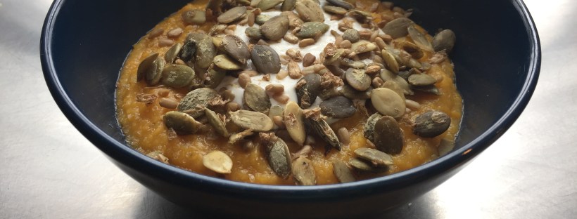 Autumn's Here: Butternut Squash Soup Serves 4 - 410 Calories Per Serving - 15g fat/52g carbs/17g protein Ingredients 1 T Olive Oil 1 Butternut Squash 1 Sweet Onion 1 Tsp Garlic powder 1 Tsp Ginger 1/2 Tsp Red Pepper Flakes 1/2 Tsp Pepper 4 Cups Vegetable Stock 1 Cup Red Lentils 1/2 Cup Sunflower … Continue reading Autumn’s Here: Butternut Squash Soup