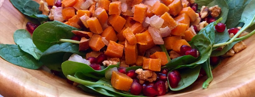 These Are A Few Of My Favorite Things Salad Serves 4 - 330 Calories Per Serving - 17g fat/40g carbs/7g protein Ingredients Olive Oil Spray 2 Sweet Potatoes 1/2 Cup Walnuts 6 Cups Spinach 1 Shallot 1 Pomegranate 2 T Apple Cider Vinegar 2 T Olive Oil 1 T Dijion Mustard 2 Tsp Xylitol 1 … Continue reading These Are A Few Of My Favorite Things Salad
